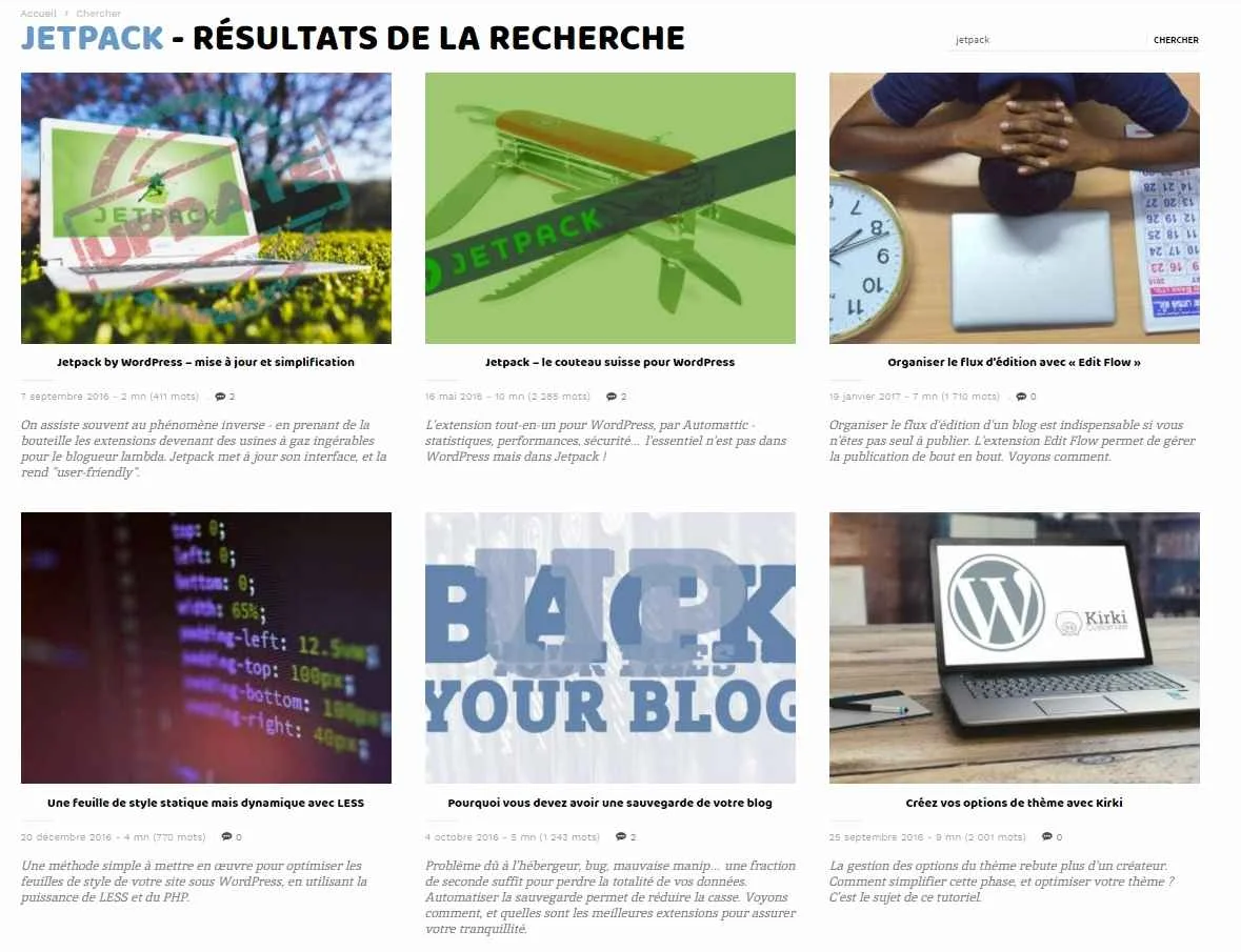 Si vous effectuez une recherche sur Jetpack par exemple, sur ce blog, le terme recherché se retrouve dans le titre des deux premiers résultats.
