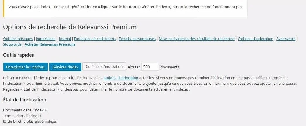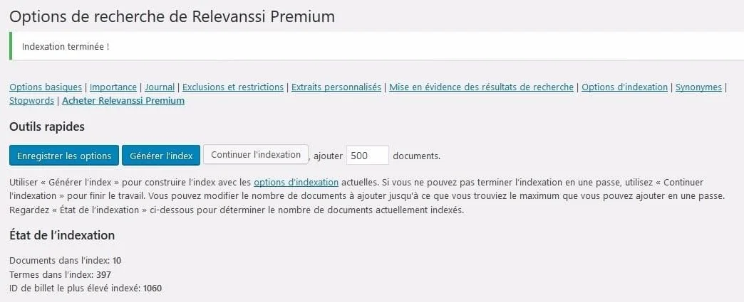 Cliquez sur Générez l’index (en haut de page, à côté du bouton Enregistrer les options). Si vous avez plus de 500 articles / pages, vous ne passerez pas tout en une fois, il faudra cliquer sur Continuer l’indexation. Ce comportement évite des bugs et des crashs sur les configurations les plus légères.
