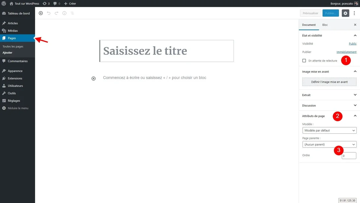 Les pages WordPress ne peuvent pas être regroupées au sein de rubriques, à la différence des articles. Par contre, il est possible de structurer l’information, avec des pages enfant liées à une page principale. Et les pages sont ajoutées au menu, pour que votre lecteur puisse y accéder.