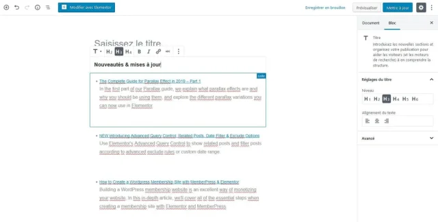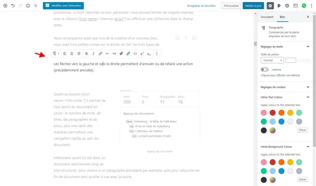 Ces blocs (Titre, Paragraphe, Liste, Citation…) bénéficient d’un menu flottant, que vous pouvez “coller” dans la barre haute, à la suite des icônes à gauche. Cette mini barre d’outils s’adapte en fonction de la nature du bloc.