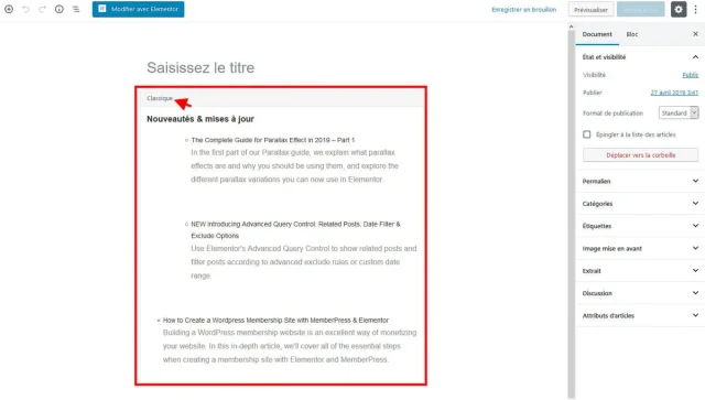 Lorsque vous ouvrez pour la première fois un article précédemment rédigé avec l’ancien éditeur, tout le contenu sera dans un bloc dit classique :
