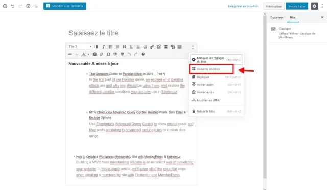 Il suffira de cliquer sur l’ellipse verticale [icon name=“ellipsis-v”] puis sur Convertir en blocs.