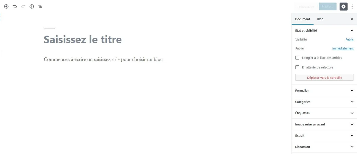 Que vous vouliez écrire un nouvel article ou mettre en ligne une nouvelle page, Gutenberg est l’interface par défaut, incontournable depuis WordPress 5.0, dans sa configuration d’origine.