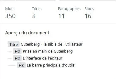 Quant au bouton [icon name=“info-circle ”] il permet de tout savoir du document en cours : le nombre de mots, de titres, de paragraphes et de blocs, plus une table des matières permettant une navigation rapide au sein du document.