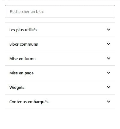 le bouton [icon name=“plus-circle ”] donne accès aux différents types de blocs, où qu’il soit situé dans l’éditeur, et l’insère à la suite du bloc courant (celui où votre curseur est positionné). Si vous cherchez un bloc particulier, vous pouvez fermer les onglets internes avec le chevron [icon name=“chevron-down”] ou effectuer une recherche dans le champ texte.