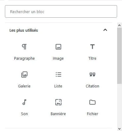 Les trois blocs essentiels sont Titre, Paragraphe et Image. Ce sont d’ailleurs ceux que vous trouverez le plus souvent à droite d’un nouveau bloc (vierge donc) dont le contenu n’a pas été défini.