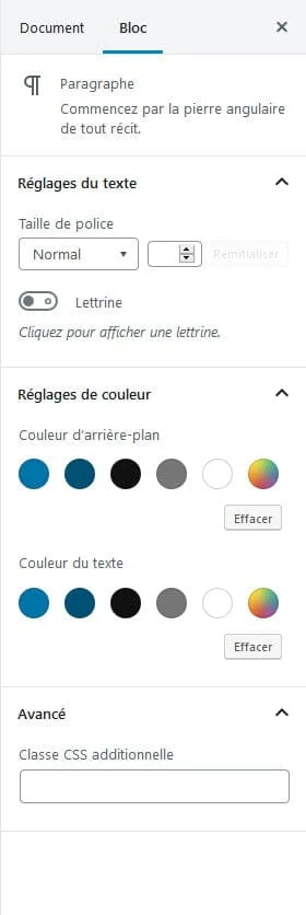 Dans l’onglet Bloc, vous trouverez l’ensemble des informations relative au bloc en cours d’utilisation. Dans la capture d’écran ci-contre, vous avez un bloc Paragraphe, avec le réglage des couleurs de texte et de fond, la taille de la police ou encore l’apparence de la première lettre, qui peut être une lettrine.