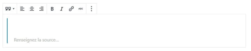 Le nouveau bloc citation est prêt à l’emploi, avec un emplacement prévu par défaut pour renseigner la source (de la citation). Agréable, surtout quand on se souvient du formatage des citations dans l’éditeur classique.
