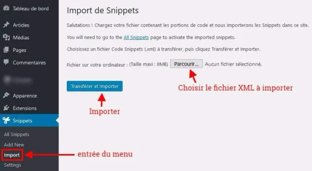 L’importation est tout aussi simple : il suffit d’aller dans l’entrée de menu Snippets > Import, de sélectionner le fichier XML à importer avant de cliquer sur Transférer et Importer.