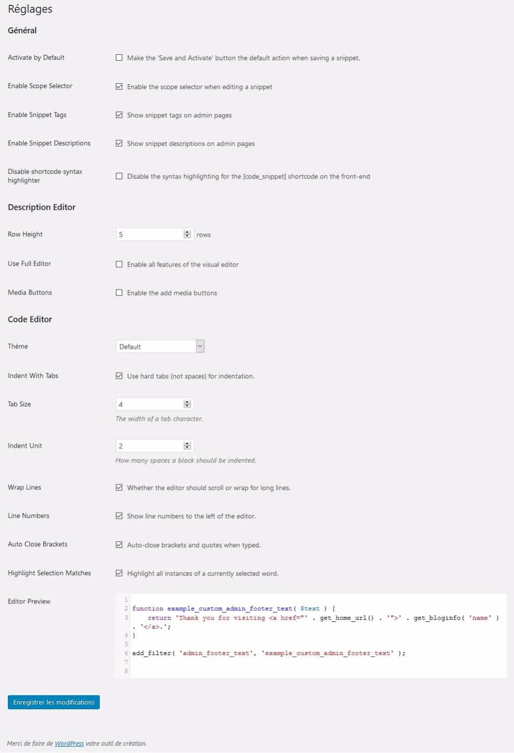 Une fois l’extension activée, une entrée Snippets est insérée dans le menu latéral de l’interface d’administration de WordPress.