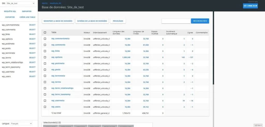 Vous pourrez également accéder au site en ligne, à l’administration du site, et à l’outil de gestion des bases de données, adminer, une alternative à phpMyAdmin, certes moins aboutie graphiquement mais bien plus légère et tout aussi puissante.