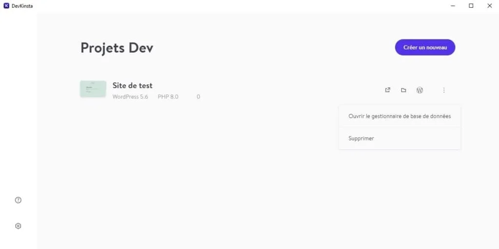 Depuis cet écran, vous avez un accès rapide à l’outil de gestion de la base de données, au site, au dossier sous Windows, à l’administration du site, et vous pouvez supprimer le site, ou en créer un nouveau (vous atterrirez sur l’écran de création de site avec les trois options vue précédemment).