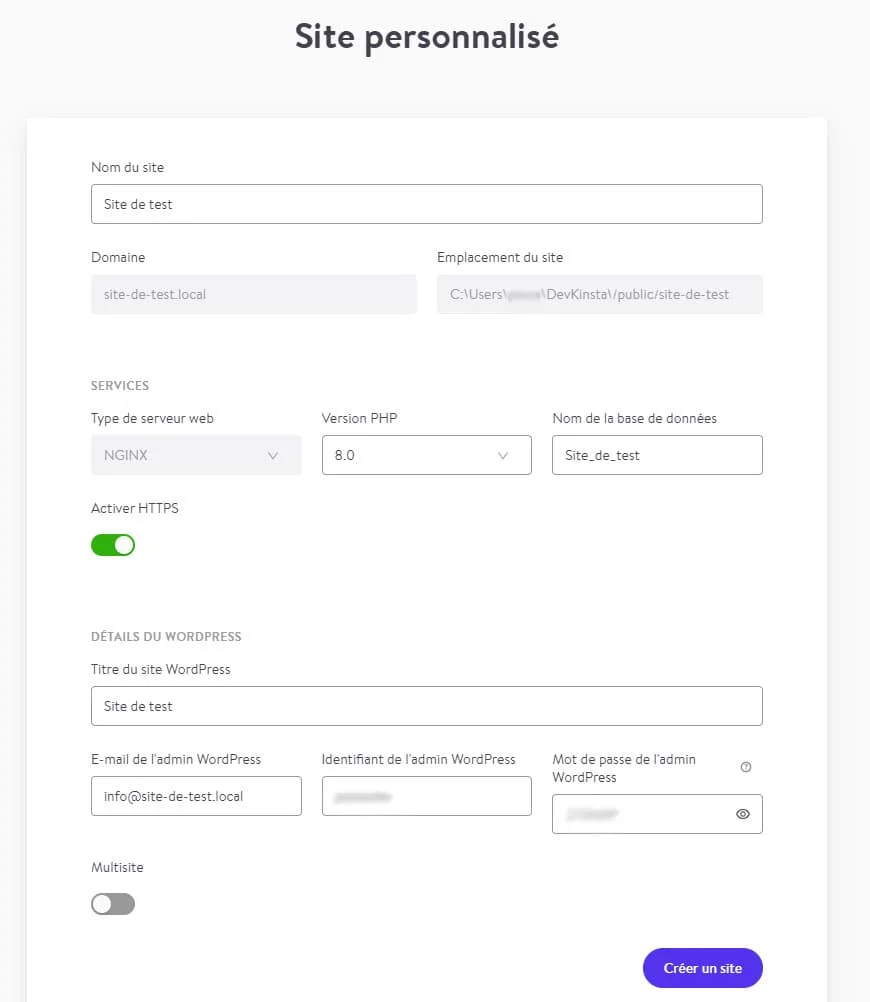 Les personnalisations portent sur la version de PHP, l’activation de HTTPS, la capacité à créer un site multisite, le nom de la base de données, le titre du site et l’email de l’admin. Intéressant. À noter toutefois que ces personnalisations - à l’exception du multisite - sont également accessibles depuis la console d’administration du logiciel, une fois que vous avez créé un site avec la procédure standard.