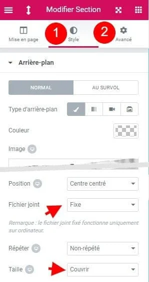 Dans la section à laquelle vous souhaitez affecter un effet parallaxe, allez dans l’onglet Style (1).