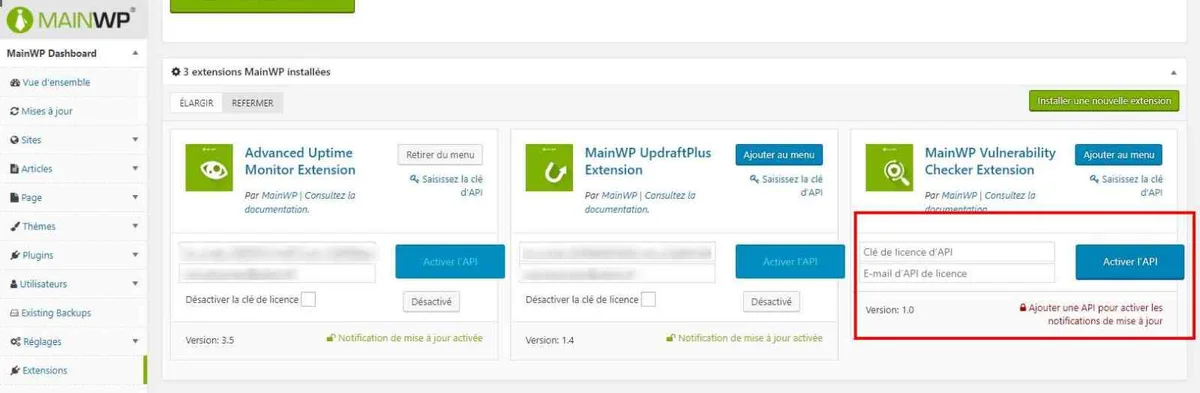 Cliquez sur Extensions dans le menu latéral de MainWP, faites défiler la page jusqu’à trouver les modules installés. Cliquez sur Saisissez la clé de licence, renseignez les champs Clé de licence d’API et E-mail d’API de licence (oui, oui, je sais, ce n’est pas du très bon français, mais bon…). Cliquez sur Activer l’API, et c’est fini.