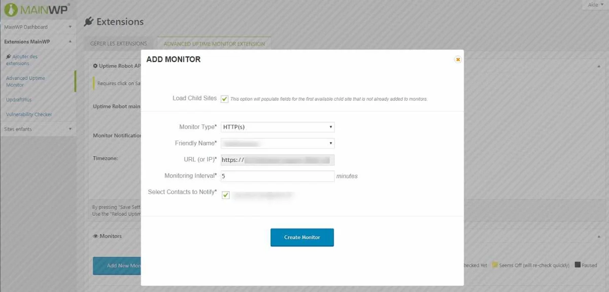 Dans le menu latéral gauche de l’extension, allez à Extensions MainWP, puis cliquez sur Advanced Uptime Monitor. Dans la section Monitors, cliquez sur Add New Monitor :
