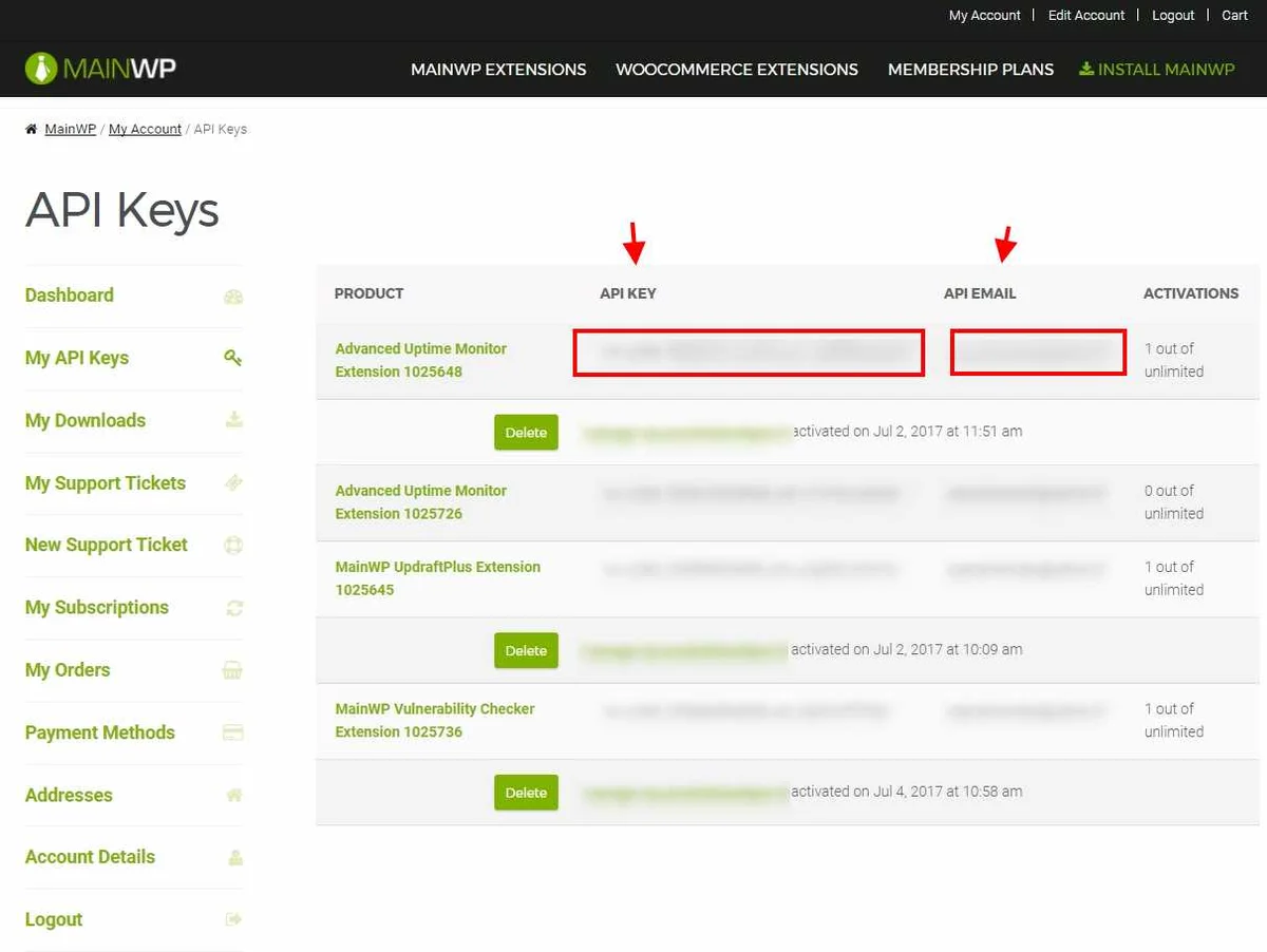 Rendez-vous dans votre compte↗ (sur le site de MainWP). Cliquez sur My API Keys dans le menu latéral.