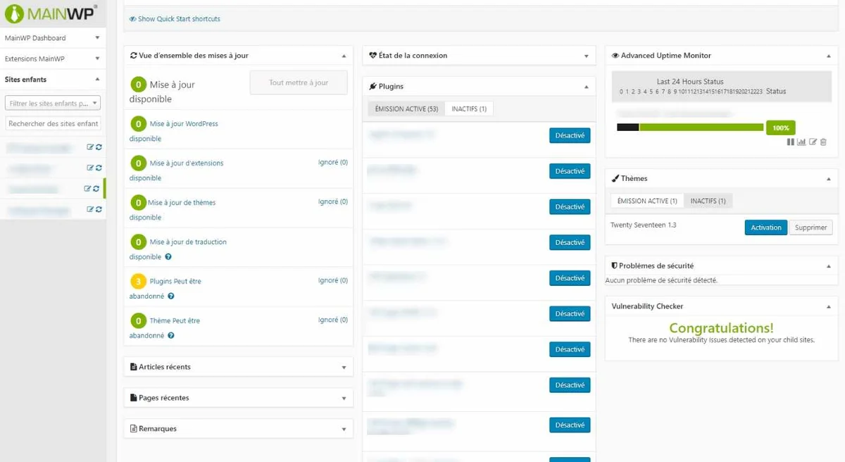La mise à jour de WordPress , des thèmes et des extensions a une importance capitale, ne serait-ce que pour garantir la sécurité de votre site. Mais si vous gérez plusieurs sites, cette opération peut vite devenir chronophage et fastidieuse. La solution ? Une interface de gestion centralisée pour les mises à jour, les sauvegardes, et pour bien d’autres tâches encore…