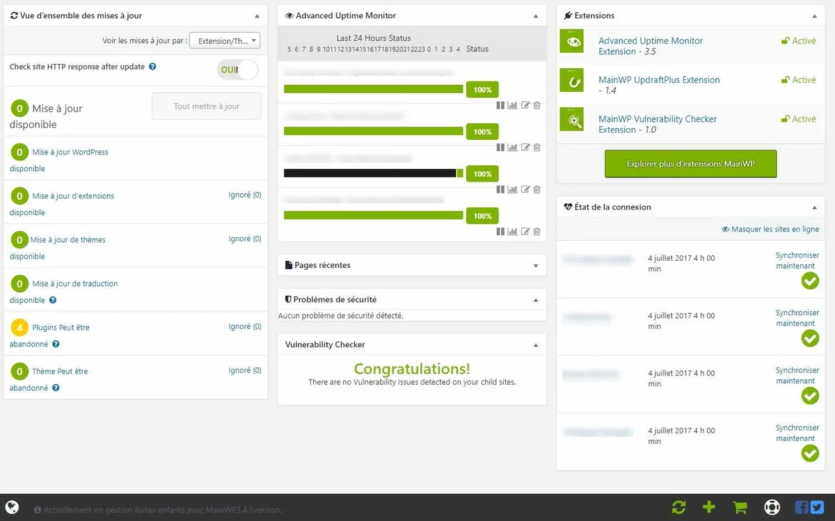 Pour tout ce qui concerne les mises à jour ou la disponibilité, vous n’aurez pas à aller bien loin : tout est dans le tableau de bord. Un simple clic, et ce n’est pas une extension, un thème ou une traduction que vous mettrez à jour, mais l’ensemble des mises à jours de tous vos sites.