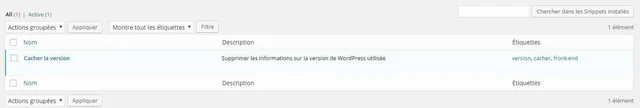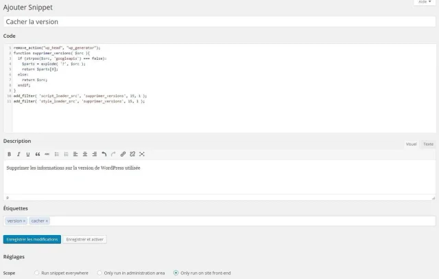 remove_action("wp_head", "wp_generator");function supprimer_versions( $src ){if (strpos($src, 'googleapis') === false):$parts = explode( '?', $src );return $parts[0];else:return $src;endif;}add_filter( 'script_loader_src', 'supprimer_versions', 15, 1 );add_filter( 'style_loader_src', 'supprimer_versions', 15, 1 );Ajoutez une description, des Ă©tiquettes (des mots clĂ©s). En bas de lâĂ©cran, vous pouvez dĂ©finir oĂč le code sâexĂ©cutera. Pour le bout de code qui nous intĂ©resse, choisissez Only run on site front-end. Puis cliquez sur Enregistrer et activer. Votre bout de code sera exĂ©cutĂ© Ă chaque fois quâune personne visitera votre site.