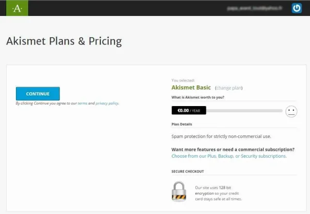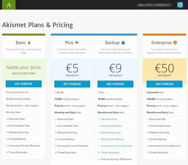 Cliquez sur le bouton bleu GET AN AKISMET API KEY. LâĂ©cran suivant va vous prĂ©senter les diffĂ©rents plans et tarifs pour Akismet. Choisissez le plan Basic et cliquez sur GET STARTED.
