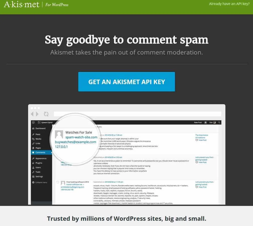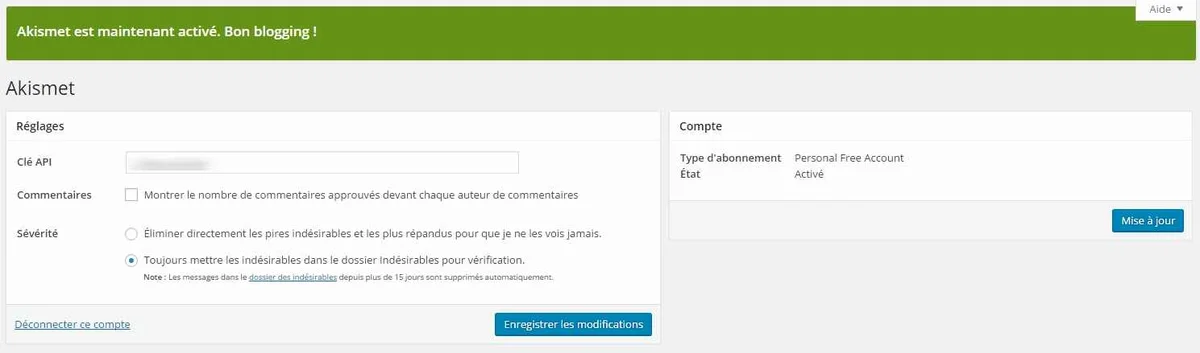 Akismet est livrĂ© avec WordPress, câest la seule extension (avec Hello Dolly) Ă faire partie de lâinstallation par dĂ©faut. Il suffira de lâactiver, et de saisir une clĂ© pour le mettre en service.