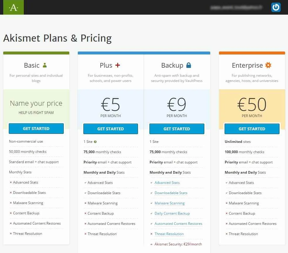 Cliquez sur le bouton bleu GET AN AKISMET API KEY. LâĂ©cran suivant va vous prĂ©senter les diffĂ©rents plans et tarifs pour Akismet. Choisissez le plan Basic et cliquez sur GET STARTED.