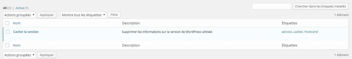 remove_action("wp_head", "wp_generator");function supprimer_versions( $src ){if (strpos($src, 'googleapis') === false):$parts = explode( '?', $src );return $parts[0];else:return $src;endif;}add_filter( 'script_loader_src', 'supprimer_versions', 15, 1 );add_filter( 'style_loader_src', 'supprimer_versions', 15, 1 );Ajoutez une description, des Ă©tiquettes (des mots clĂ©s). En bas de lâĂ©cran, vous pouvez dĂ©finir oĂč le code sâexĂ©cutera. Pour le bout de code qui nous intĂ©resse, choisissez Only run on site front-end. Puis cliquez sur Enregistrer et activer. Votre bout de code sera exĂ©cutĂ© Ă chaque fois quâune personne visitera votre site.