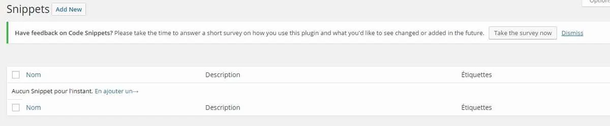 Vous nâavez pas encore enregistrĂ© de bout de code, celui-ci sera le tout premier. Cliquez sur Add New en haut Ă droite, ou sur En ajouter un un peu plus bas. Voici Ă quoi ressemble lâĂ©cran de saisie :