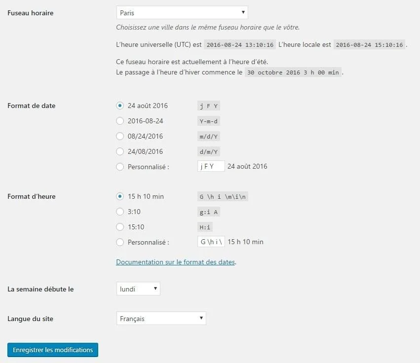 Dans lâinterface dâadministration de WordPress, cliquez sur RĂ©glages > GĂ©nĂ©ral. RĂ©glez le fuseau horaire, le format de la date, le premier jour de la semaine.