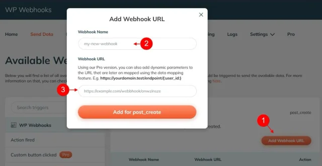Tu retournes dans l’admin WordPress, tu vas dans Réglages > WP Webhooks, en haut de ta page tu cliques sur Send data, dans le champ de recherche Search triggers tu commences ta saisie avec post, tu sélectionnes Post created. Tu cliques sur Add Webhook URL(1), tu nommes ton webhook (2), tu renseignes l’URL de test, pour le moment (3). Tu vas dans le menu à trois points verticaux à droite de ton nouveau hook, tu cliques sur Send demo. Si tout es bien réglé, tu vas avoir le bloc 3 qui ressemble étrangement à celui de la capture d’écran (normal, ce sont les données de démo).