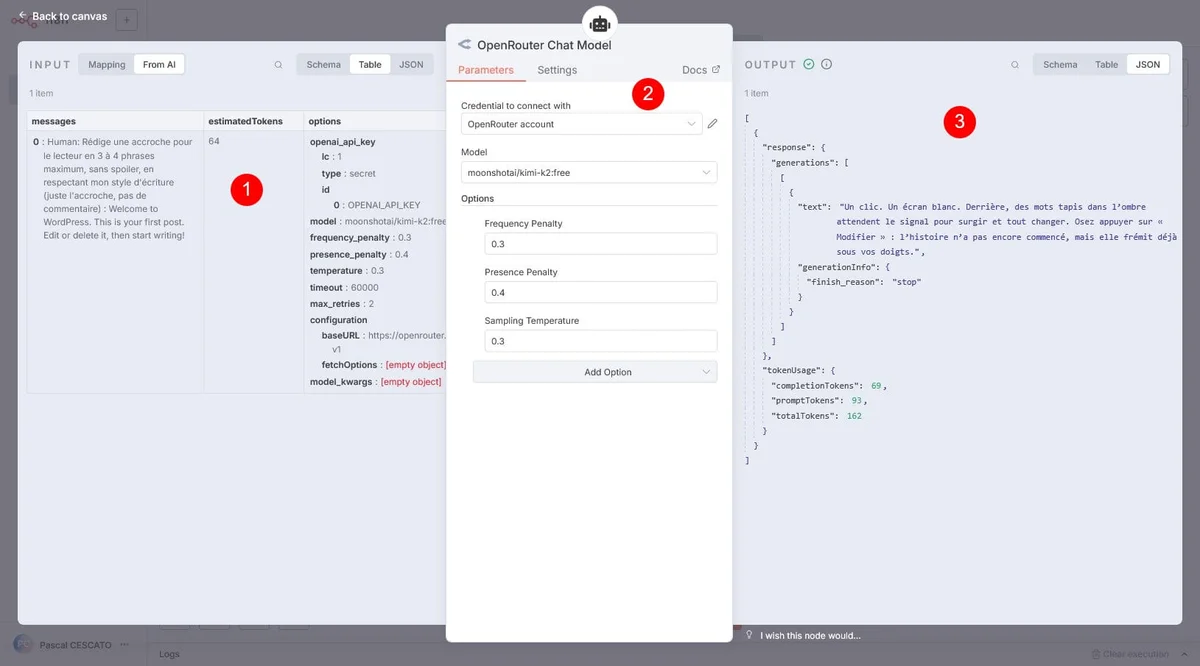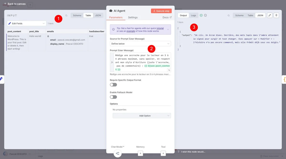 Dans le bloc 3, tu as la sortie json. C’est la donnée que tu utiliseras dans les nœuds suivants. Et le nœud suivant, c’est un nœud AI Agent. Je ne te fais pas l’affront de t’expliquer à quoi il sert… :D