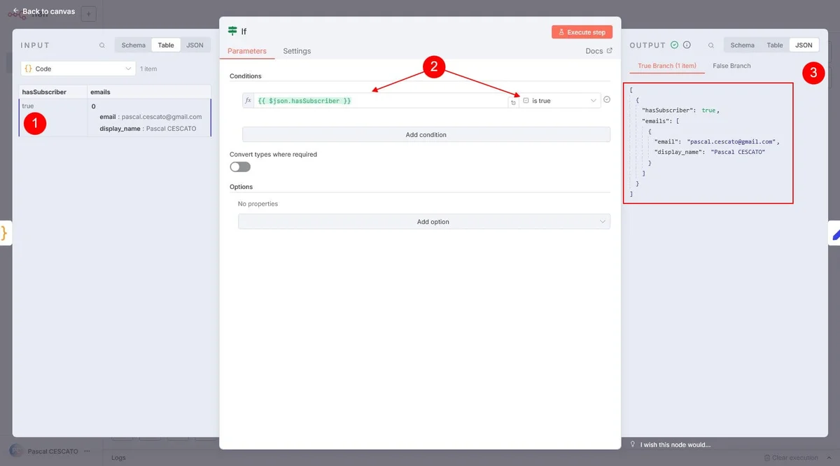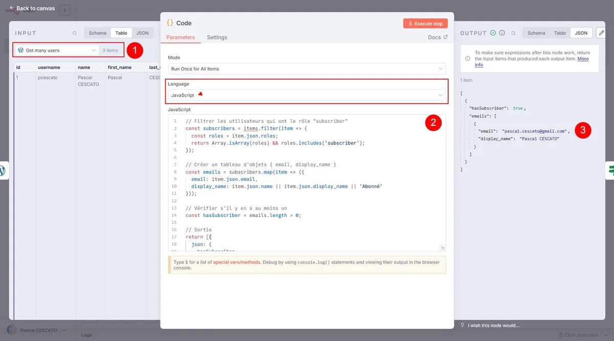 // Filtrer les utilisateurs qui ont le rôle "subscriber"const subscribers = items.filter(item => {const roles = item.json.roles;return Array.isArray(roles) && roles.includes('subscriber');});// Créer un tableau d'objets { email, display_name }const emails = subscribers.map(item => ({email: item.json.email,display_name: item.json.name || item.json.display_name || 'Abonné'}));// Vérifier s'il y en a au moins unconst hasSubscriber = emails.length > 0;// Sortiereturn [{json: {hasSubscriber,emails // <-- maintenant un tableau d'objets [{email, display_name}, ...]}}];Et tu obtiens un tableau json des abonnés et de leurs noms. Utile pour envoyer un email personnalisé. Et pour vérifier qu’il y a au moins un abonné. Ce qui nous emmène au point suivant…