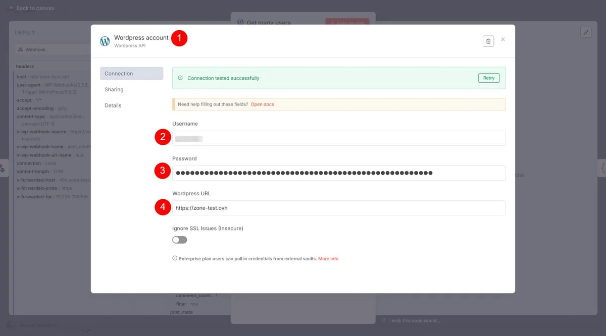Dès qu’un article est mis à jour, WordPress envoie un flux de données à n8n, qui le traite. Ce qui déclenche les actions suivantes, toutes conditionnées par la première (forcément). Pour que n8n écoute, il lui faut un Webhook, c’est le point d’entrée du Workflow.