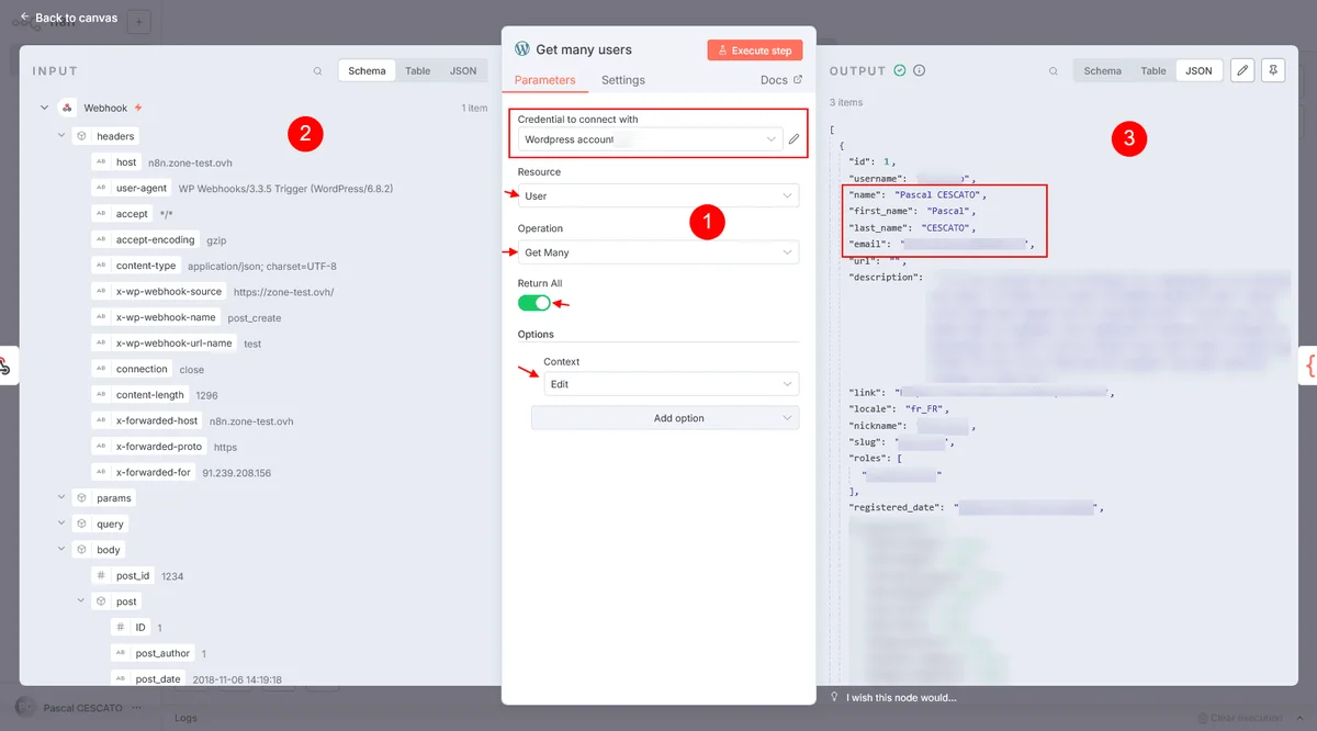 Une fois la connexion WordPress enregistrée, tu peux retourner à ton nœud Get Many Users. Le bloc 1 ne te sert pas, par contre tu as tout à voir dans le bloc 3. C’est là que se trouve ce qui te servira plus tard dès que tu as cliqué sur Execute step : les first_name et email.