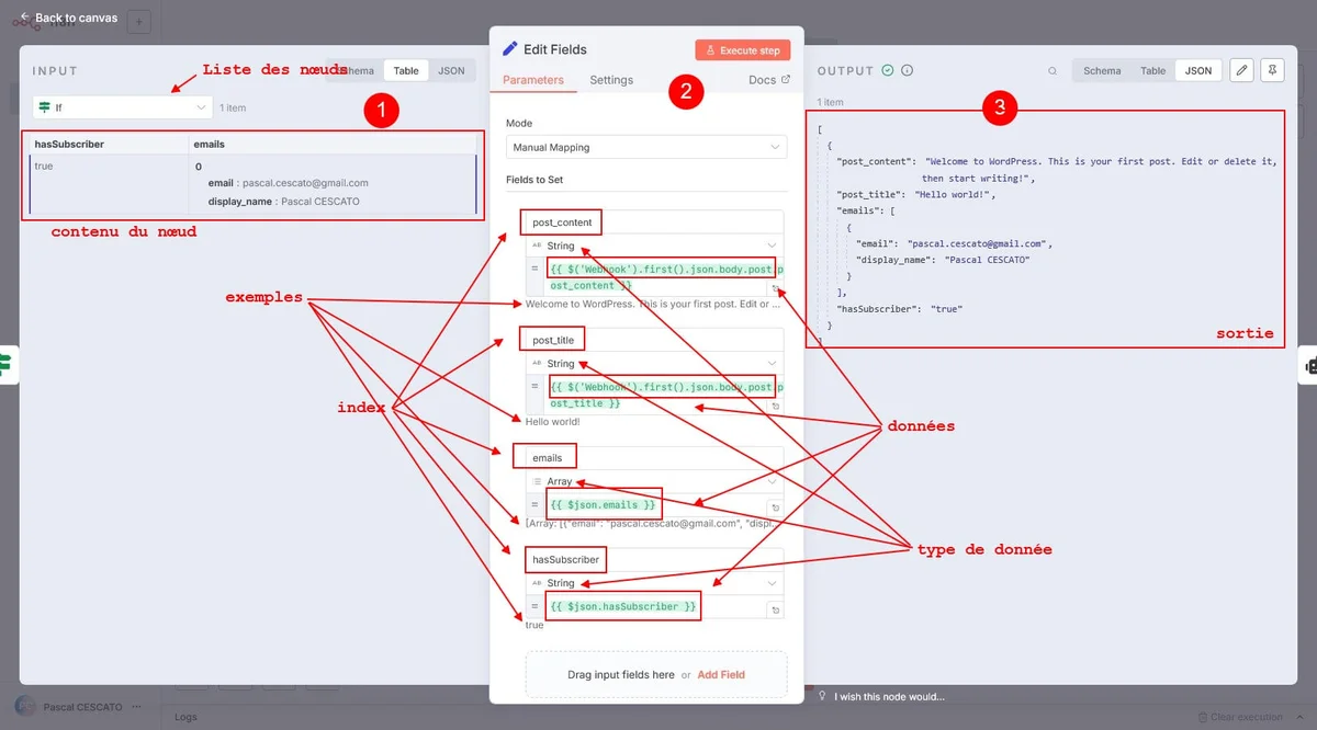 Dans le bloc 1, tu peux choisir le nœud dans lequel tu vas piocher les données. Comme tu le vois dans la capture d’écran, il y a plusieurs origines. Et pour chaque donnée, tu as l’index du tableau json que tu obtiendras en sortie, le type de donnée, la donnée et un exemple de la sortie.