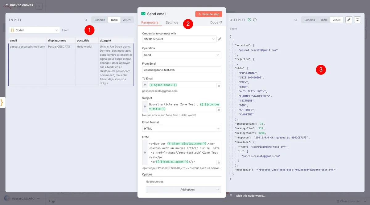 Tu prends les données du bloc 1, tu les insères là où tu en as besoin dans le bloc 2 (et c’est là que tu retrouve le nom de l’utilisateur, qui te permet de personnaliser ton envoi). Cliques sur Execute step, et miracle, tu vas recevoir ton premier email, qui t’informe de la parution d’un nouvel article.