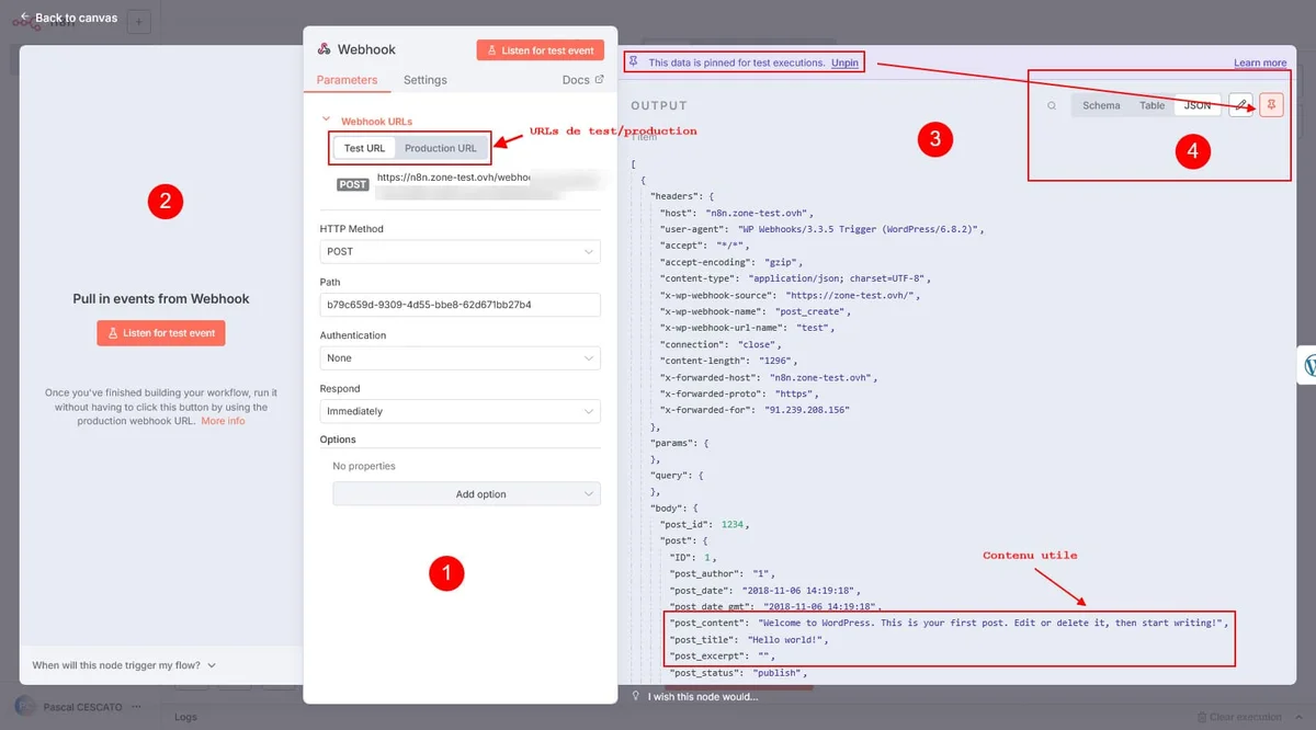 Dernière étape : tu as tout géré avec l’url de test, il te faut maintenant retourner au Webhook (le point d’entrée de ton workflow, copier l’url de production et créer un nouveau webhook dans WP Webhooks avant de supprimer l’ancien - une fois créé, il n’est pas modifiable. Pas top, mais vu que l’opération ne prend que quelques secondes, ce n’est pas très grave.