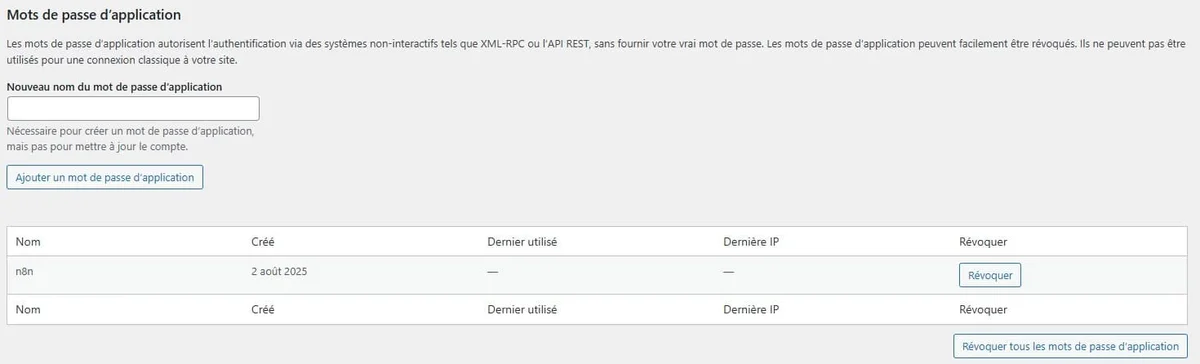 Tu vas avoir besoin d’un mot de passe d’application. Pour le créer, va dans l’administration de ton site WordPress, à Comptes > Administrateur/administratrice et sélectionne ton compte ou un compte avec les mêmes droits. S’il ne s’agit pas d’un site perso, tu devrais même créer un compte administrateur pour ce type d’actions (nomme le automatisation par exemple), ça évitera de casser l’appli si ton compte à toi est supprimé. Rends toi à la section suivante :