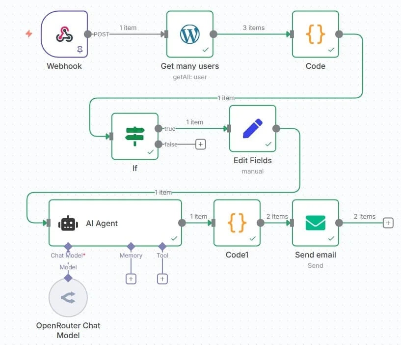 Tu remarqueras de suite que tu as plus d’étapes dans le workflow n8n que dans le workflow conceptuel : c’est normal, il y a des étapes qui nécessitent un post-traitement. Quand tu as récupéré les utilisateurs dans WordPress par exemple, c’était de la récupération brute, il a fallu récupérer le nom et l’adresse email, le reste ne te servait à rien dans le flux.