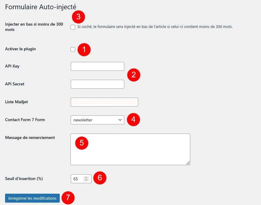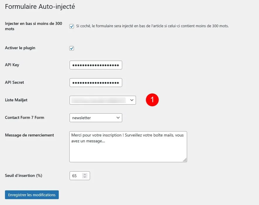 Vous ne règlerez pas la totalité des options en une seule passe : Le choix de la liste Mailjet n’est possible qu’après avoir saisi la clé d’API et la clé secrète.