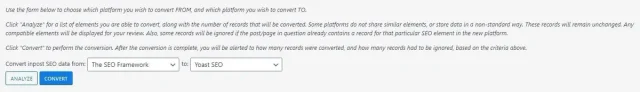 Lâoutil est simple Ă prendre en main, il y a deux listes dĂ©roulantes, la premiĂšre pour choisir le format initial, la seconde pour spĂ©cifier le format cible. Dans notre cas, The SEO Framework en origine et Yoast SEO en cible. Vous analysez, vous devriez obtenir un tableau listant les Ă©lĂ©ments convertibles. Vous cliquez ensuite sur Convert pour effectuer une conversion non destructive.