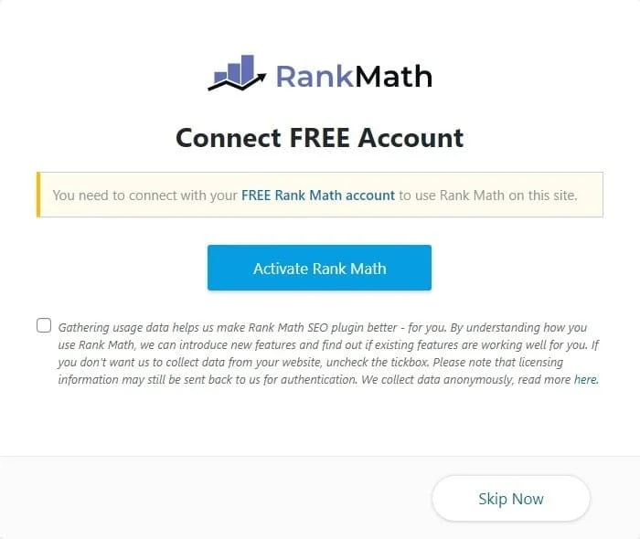 Une fois que vous vous ĂȘtes enregistrĂ© et connectĂ© Ă votre compte Rank Math, vous pouvez lancer la configuration de lâextension. En cliquant sur Activate Rank Math, vous gĂ©nĂ©rez une demande dâautorisation aux services Google Analytics, Adsense et Search Console.