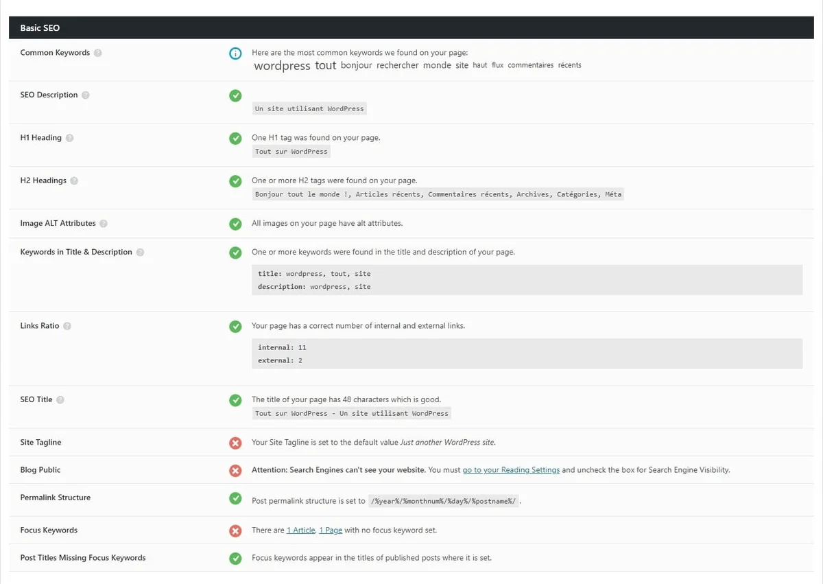 Lâensemble des indicateurs de cette section devraient ĂȘtre au vert. Câest le minimum syndical pour espĂ©rer une indexation correcte dans les moteurs de recherche.