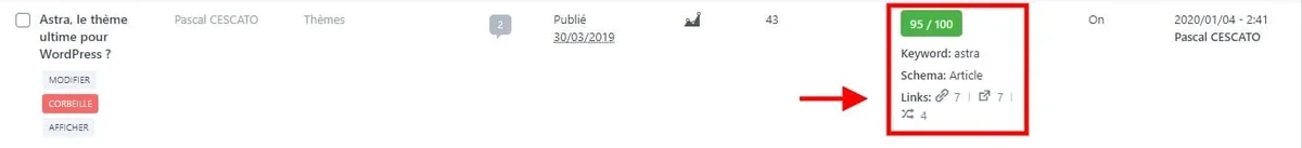 Pour vous donner un exemple, jâai commencĂ© cet article avec un score de 29, et au trois quarts de la rĂ©daction, jâatteignais un score de 96, pour culminer Ă 99 juste avant de publier. Sans optimisation particuliĂšre, juste en suivant ma trame et en appliquant certains conseils que vous trouverez sur ce blog dans lâarticle 13 points essentiels pour optimiser la SEO sous WordPress.