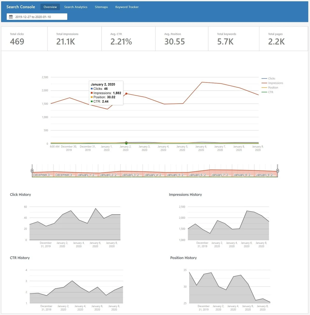 Lâonglet Overview (vue dâensemble) reprend les principaux indicateurs sous forme de graphiques :