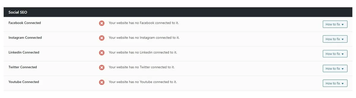 Pour finir, Rank Math vérifie la connexion du site aux réseaux sociaux :