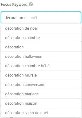 Lors de la saisie dâun mot clĂ©, Rank Math vous suggĂšre des mots et expressions clĂ©s, qui peuvent ĂȘtre utiles pour la longue traĂźne, et pour trouver des alternatives au mot clĂ© principal. Voici pour le mot dĂ©coration par exemple :