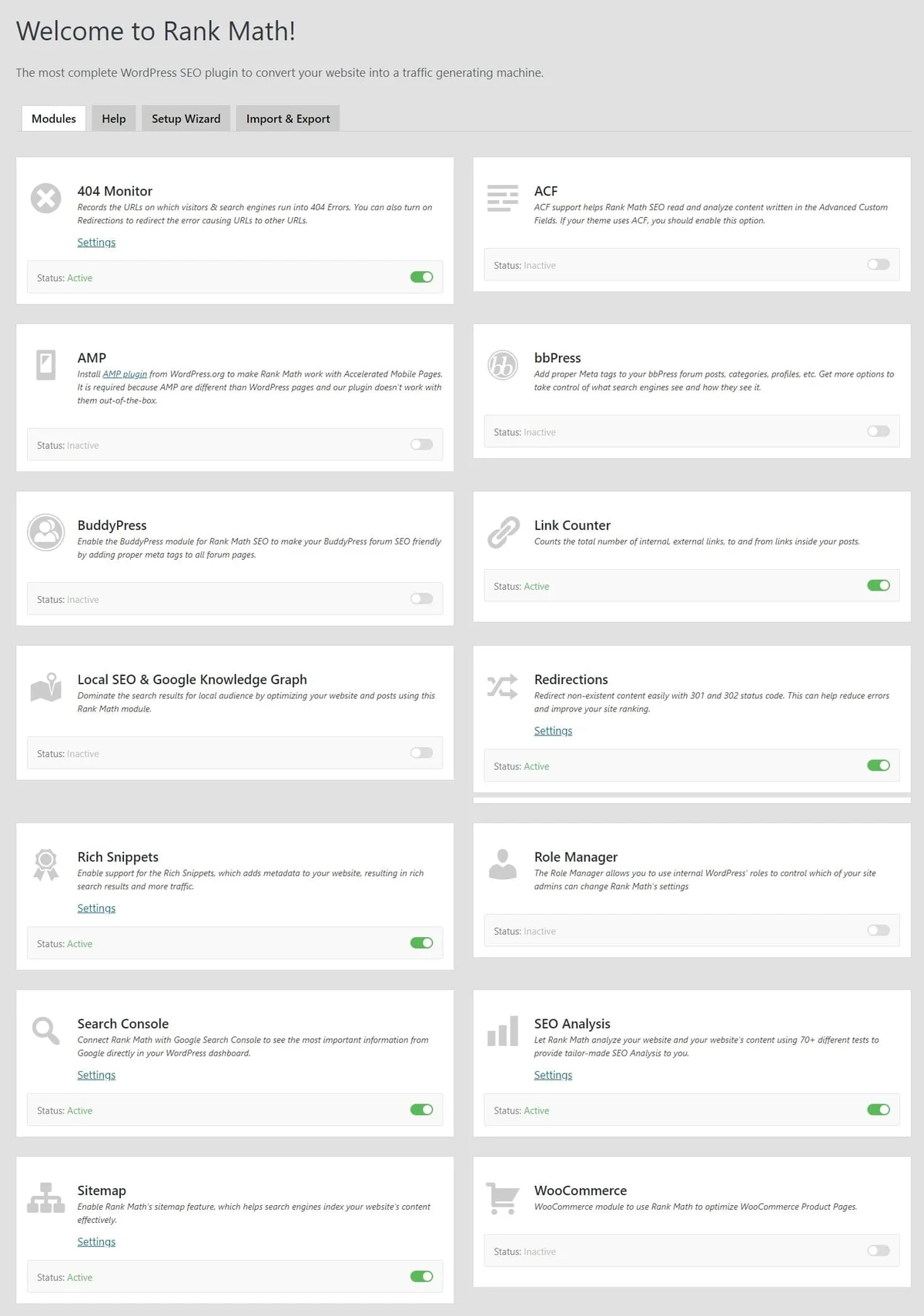 A partir du tableau de bord, vous pouvez atteindre nâimporte quelle section de Rank Math, les activer, les dĂ©sactiver et accĂ©der directement aux rĂ©glages lorsque vous trouvez un lien Settings dans la section.