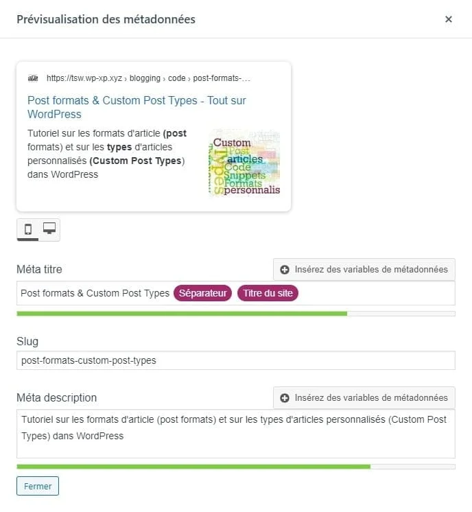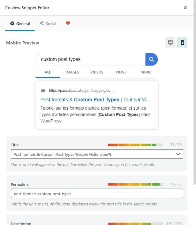 L’extension permet aussi une prévisualisation plus fine du rendu dans les moteurs de recherche et dans les réseaux sociaux. La prévisualisation Yoast, sans être mauvaise, est plus basique.